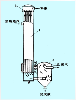 原理:溶液預(yù)熱到接近沸點(diǎn)時(shí)由蒸發(fā)器底部送入,進(jìn)入加熱管時(shí)立即受熱沸騰汽化,溶液在高速上升的二次蒸汽帶動(dòng)下,沿管壁邊呈膜狀向上流動(dòng)邊蒸發(fā)。到達(dá)分離室后,完成液與二次蒸汽分離后由分離室底部排出。