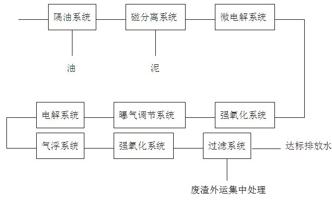 鉆井污泥漿經(jīng)泥漿泵吸入,通過(guò)隔油池隔油后,泵入磁分離系統(tǒng),進(jìn)入磁分離機(jī)的泥漿分別經(jīng)過(guò)各攪拌桶,分別加入混凝劑、絮凝劑、磁助劑。攪拌后進(jìn)入磁分離機(jī)的主機(jī),磁分離部分分離,通過(guò)壓泥機(jī)后,污泥排出機(jī)外,可裝袋,也可裝入鐵箱,外運(yùn)填埋;污水進(jìn)入調(diào)節(jié)池加酸,調(diào)PH值至2.5~3,泵入微電解池,在微曝氣的情況下電解3小時(shí),PH≈5左右,進(jìn)入斜板沉淀池,沉淀后的廢水加酸調(diào)PH值后,進(jìn)入強(qiáng)氧化池,在強(qiáng)氧化池加強(qiáng)氧化劑、催化劑攪拌后進(jìn)入反應(yīng)階段,為了充分反應(yīng),延長(zhǎng)反應(yīng)時(shí)間,強(qiáng)氧化池設(shè)計(jì)成迷宮式,出水泵入曝氣調(diào)節(jié)池,曝氣調(diào)節(jié)池配置有PH自動(dòng)測(cè)控儀和自動(dòng)加堿裝置,自動(dòng)加混凝劑裝置,在潛水曝氣機(jī)的攪拌下將PH值調(diào)到6.5左右。羅茨風(fēng)機(jī)通過(guò)潛水曝氣機(jī)連續(xù)曝氣充氧,水中的二價(jià)鐵離子變成三價(jià)鐵離子。曝氣后的廢水進(jìn)入中間水池1,上清液泵入電解槽電解,中國(guó)的石油以烴類為主,以直長(zhǎng)鏈及環(huán)鏈狀的形態(tài)存在,通過(guò)電解,直長(zhǎng)鏈與環(huán)鏈狀被打斷,可被后續(xù)的氣浮刮渣去除;重金屬,電解如用鋁極板,在PH=4~8的范圍內(nèi),Cu,Zn和Cr(Ⅵ)均可有效去除;采用鐵極板作為陽(yáng)極板,溶解產(chǎn)生的二價(jià)鐵離子還原為三價(jià)鐵離子,將二價(jià)鉻變成三價(jià)鉻,隨著電解過(guò)程的進(jìn)行,廢水中氫離子逐漸減少,結(jié)果使廢水堿性增強(qiáng),在堿性條件下,三價(jià)鉻和三價(jià)鐵以氫氧化鉻和氫氧化鐵的形式沉淀下來(lái)。